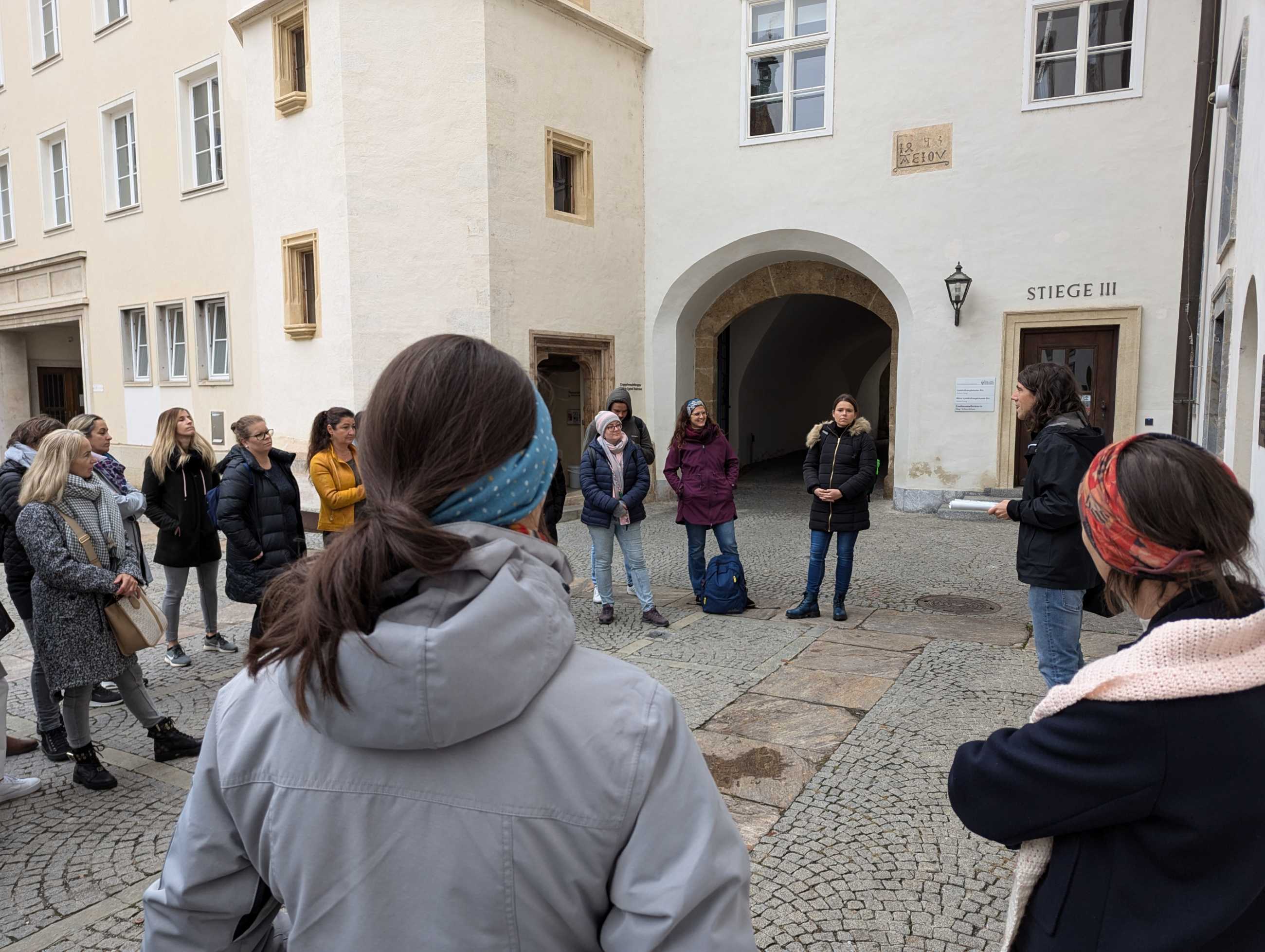 7. Station - Minoritenkloster/Mariahilferplatz: vorbei an den Weihrauchschwaden aus einer Kapelle des Areal, bei dem gerade ein orthodoxer Gottesdienst sein Ende findet, begeben wir uns in den hintersten Hof der Klosteranlage, wo die Studierenden Informationen zur Gemeinschaft der Minoriten, das bauliche Arrangement, vor allem aber auch bezüglich der aktuellen Nutzung des Areals erhalten, das von der ukrainisch griechisch-katholischen Gemeinde in Graz in gleicher Weise wie von der russisch-orthodoxen Kirchengemeinde genutzt wird.